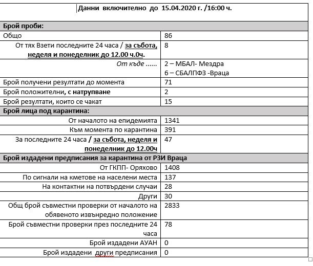 Очакват се резултатите от общо 15 проби за COVID-19, сочат последни данни от РЗИ-Враца.