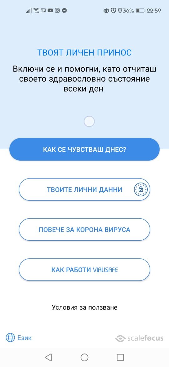 В подкрепа при борбата с пандемията COVID-19, българската технологична компания Scalefocus разработи специализирано мобилно приложение. ViruSafe дава възможност на всички пребиваващи на територията на Република България да се включат и помогнат в този труден момент, въвеждайки ежедневно своите здравни показатели и симптоми.