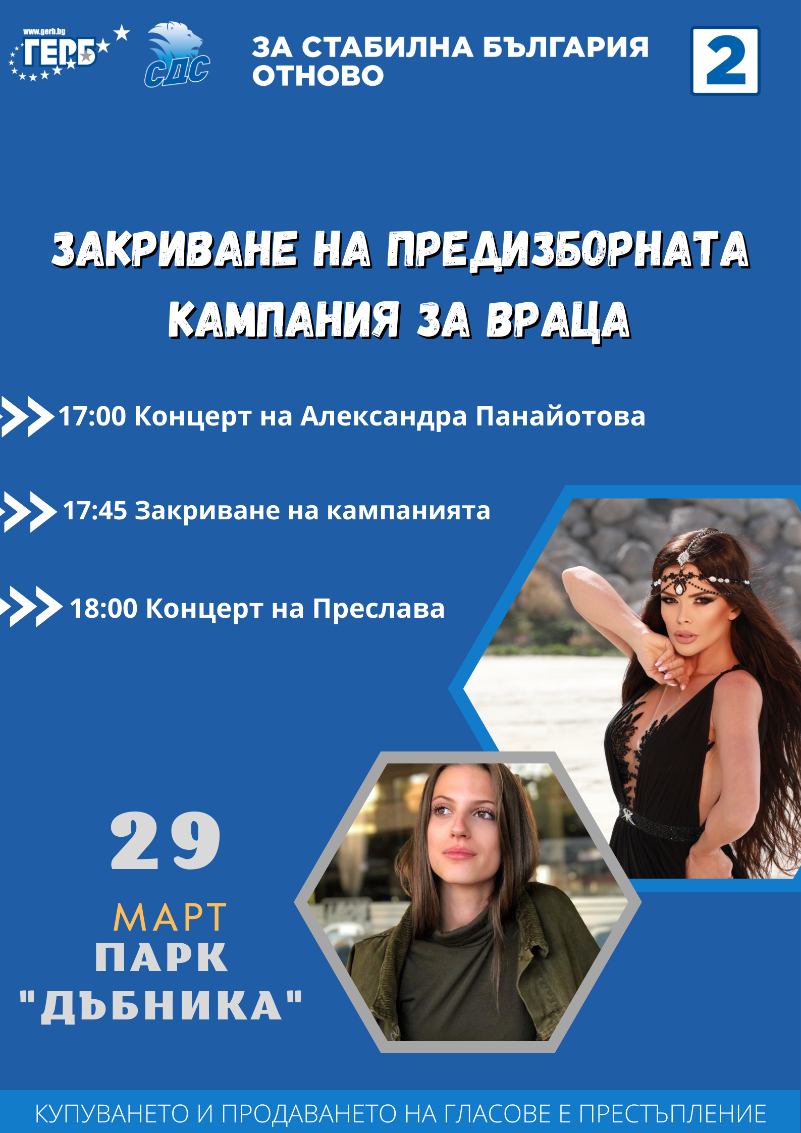 Коалиция ГЕРБ-СДС ви кани на закриване на предизборната кампания за Враца.