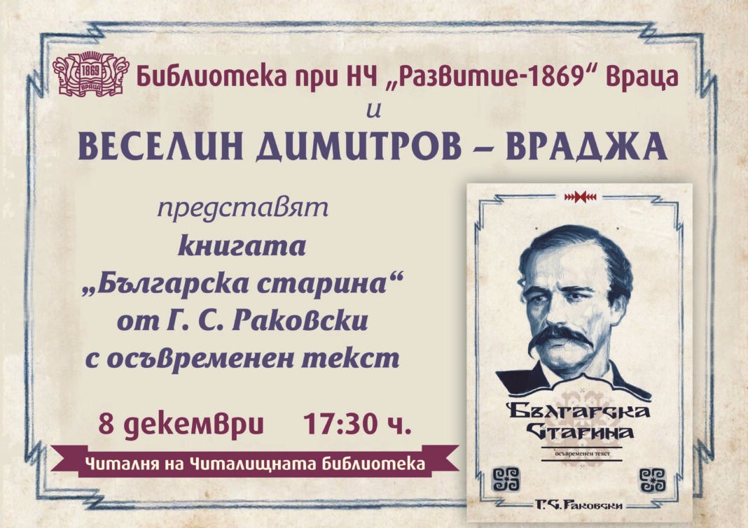 Библиотеката при НЧ „Развитие – 1869“ – Враца представя книгата „Българска старина“ от Г. С. Раковски. Срещата ще се състои на 8 декември (понеделник) 2025 г. от 17:30 ч. в читалнята на библиотеката.