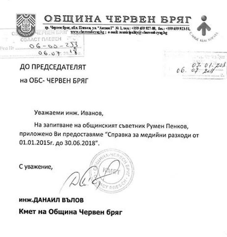 От началото на 2016 година община Червен бряг, в лицето на кмета Данаил Вълов, е подписала няколко договора за отразяване на събития, свързани с нея и така наречения медиен мониторинг. Започвайки от БТА, преминавайки през регионалната медия „Плевен за Плевен“, собственост на народния избраник Стефан Бурджев от БСП, та до 4 листа „лачен“ вестник на местен жител на града, който редовно „хигиенизира с белина“ вече доста изцапания имидж на бедстващата община. Интересното е, че според всички запитани колеги тези договори не са реални, а журналистиката, която пробутват на гражданите е обективна – нищо, че гласът на народа казва едно, а медията повтаря и приглася това, което казва този, който плаща. Или както се казва „Който плаща той поръчва музиката“. БТА Плевен например взима сумата от 500 лева за една година през 2016 г., за да отразява пресконференциите на кмета на община Червен бряг. Нищо, че избирателите му, които живеят в Червен бряг не са в Плевен. Други агенции, медии и пр. взимат между 500 и 1200 лева на месец или годишно за различни медийни „кампании“. В това число включваме и тези, които публикуват съобщенията на общинското ръководство, което е задължено да го прави по закон. „Зов нюз“ обаче пита, колко пари взима на месец Сашо Александров от медията „Червенобрежка трибуна“ за медийно обслужване, освен тези, които е получил по европроекти, в които е включена фирмата/медията, която представлява. Бърза справка в ИСУН показва, че работи по няколко общински проекта. По повод медийното обслужване, за което плаща администрацията на Червен бряг, „Зов нюз“ изпрати запитване по ЗДОИ и до „Червенобрежка трибуна“ и до Община Червен бряг. Екипът ни разбра, че в средата на годината общински съветник е поискал сходна информация от кмета и съответно е получил отговор, който обаче звучи повече от интересно. За медийни разходи за 2016 година, общината е платила 180 лева, а договорите, които може да видите в материала (това са част от тях) показват по – голяма сума. В графа „поздравителен адрес за 2016 година” е посочена сумата от 250 лева, а за 2018г. – 450 лв. Тук се поражда въпросът – при наличие на цяла дирекция „образование, култура и спорт“ с директор на дирекция и ресорен зам.-кмет, както и поне 5 служители в същата структура, защо общината плаща на външна фирма за изготвяне на въпросните поздравления? Така на практика общината си купува с буквално смешна цена местен медиен комфорт.