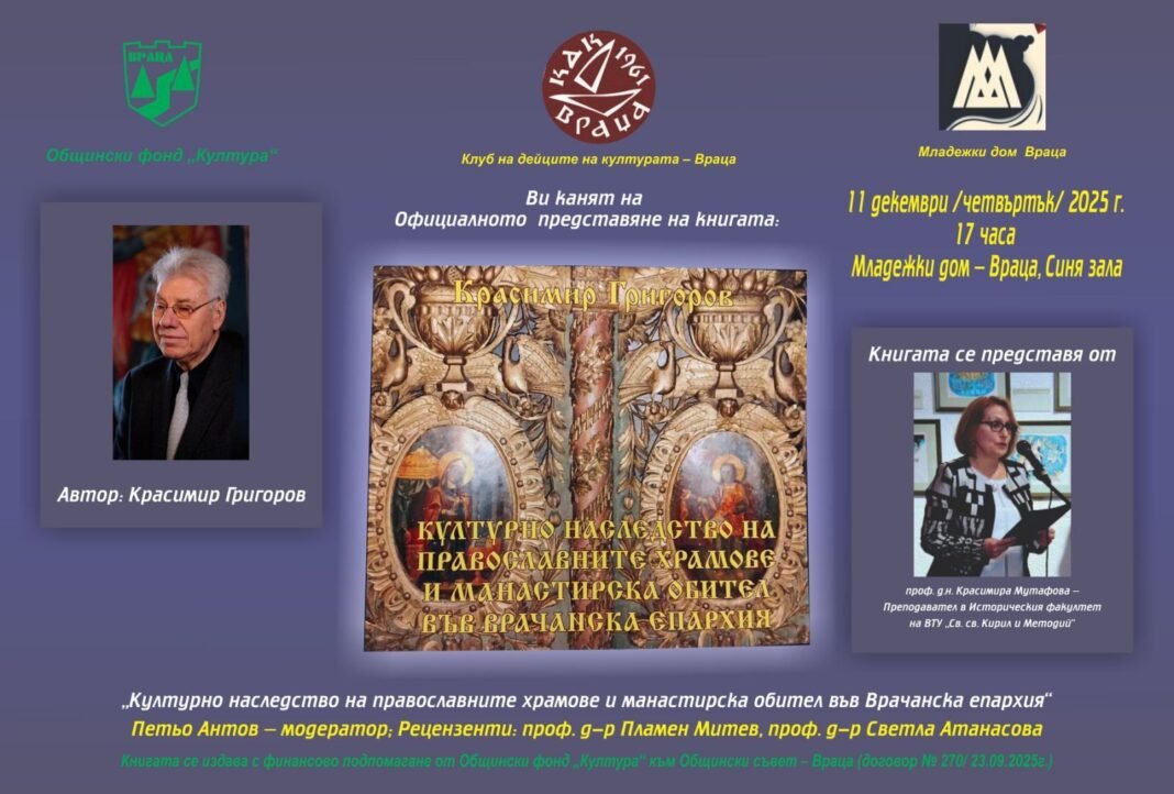 На 11 декември 2025 г. в Младежки дом – Враца ще се състои официалното представяне на новата книга „Културното наследство на православните храмове и манастирска обител във Врачанска епархия“ с автор Красимир Григоров. Събитието започва в 17:00 часа и е отворено за всички ценители на историята, духовността и културното наследство на региона.