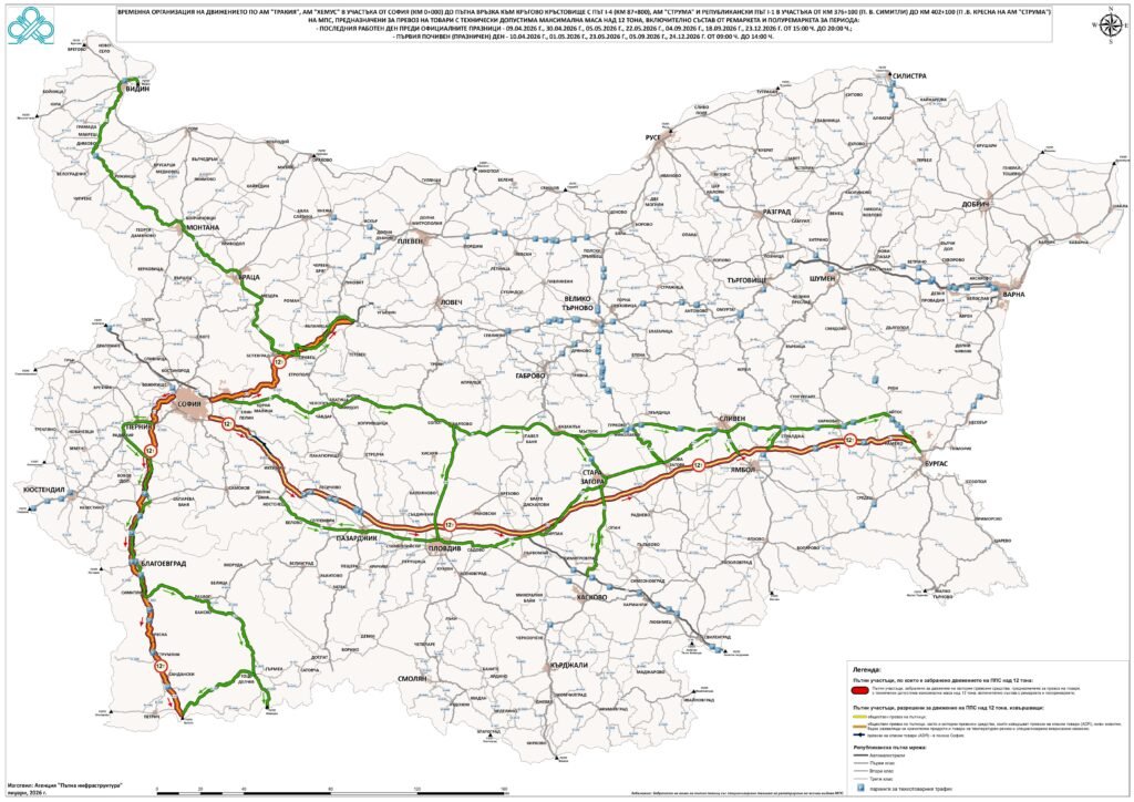 На интернет страницата на Агенция „Пътна инфраструктура“ е публикувана заповедта, която регламентира движението в определените празнични дни по АМ „Тракия“, АМ „Хемус“ – в участъка от София (км 0) до пътна връзка при кръгово кръстовище с път I-4 (87-ми км), АМ „Струма“ и републикански път I-1 в отсечката от п. в. „Симитли“ (376-ти км) до п. в. „Кресна“ на АМ „Струма“ (402-ри км). В нея са посочени предстоящите ограничения за преминаване на тежкотоварните автомобили в определените дни и часове.