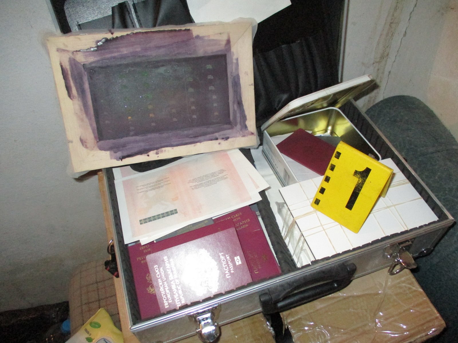 Намерени са над 100 бели пластики, подготвени за производство на лични карти и свидетелства за управление на моторни превозни средства, матрица, бои, мастила. Иззети са три компютърни конфигурации, шест принтера, гравираща машина, иглен плотер, ламинатор, инструменти за фина техника, термоламиниращи фолиа с релефни мотиви и кинеографски елементи.