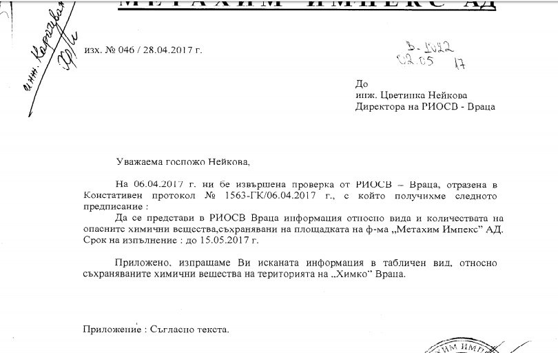 Токсичният химикал е открит при извършена от експерти на РИОСВ Враца контролна проверка на бившия торов завод „Химко“АД, в един от складовете за съхранение на химични вещества.