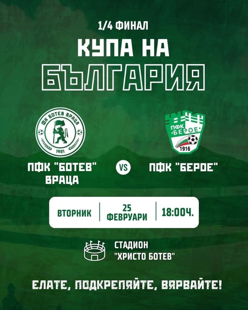 На 25 февруари (вторник) от 18:00 ч. на стадион „Христо Ботев“ ще се проведе четвъртфиналният двубой за Купата на България между ПФК „Ботев“ Враца и ПФК „Берое“. Това е изключително важен мач за града ни и за клуба, който е част от историята и футболната традиция на Враца.