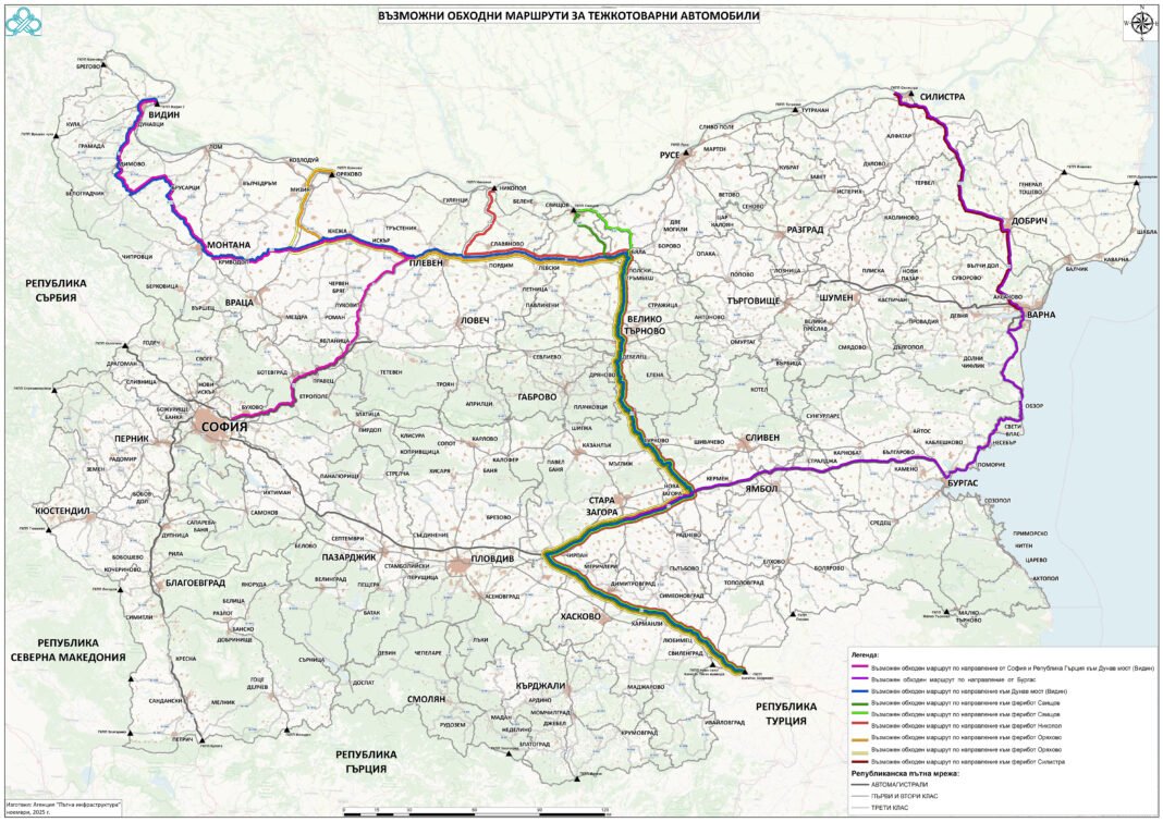 В периода на ограничение водачите могат да използват като алтернативен маршрут първокласния път I-1 София – Видин и Дунав мост 2 за преминаване в Румъния. Възможен обходен маршрут е и през път I-7 Силистра – Шумен, от връзката с АМ „Хемус“ до ГКПП Силистра. Подробна карта на алтернативните маршрути за движение може да бъде намерена тук. При спирането на трафика по Дунав мост шофьорите на тежкотоварни превозни средства ще могат да ползват паркинги и площадки за отдих в областите Русе, Велико Търново, Ямбол и Хасково. Карта с местата за изчакване са в приложения линк.