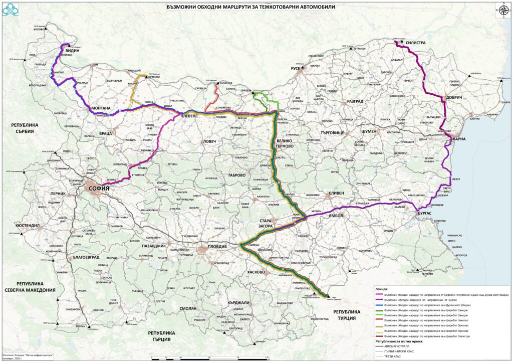 В периода на ограничение водачите могат да използват като алтернативен маршрут първокласния път I-1 София – Видин и Дунав мост 2 за преминаване в Румъния. Възможен обходен маршрут е и през път I-7 Силистра – Шумен, от връзката с АМ „Хемус“ до ГКПП Силистра. Подробна карта на алтернативните маршрути за движение може да бъде намерена тук. При спирането на трафика по Дунав мост шофьорите на тежкотоварни превозни средства ще могат да ползват паркинги и площадки за отдих в областите Русе, Велико Търново, Ямбол и Хасково. Карта с местата за изчакване са в приложения линк.