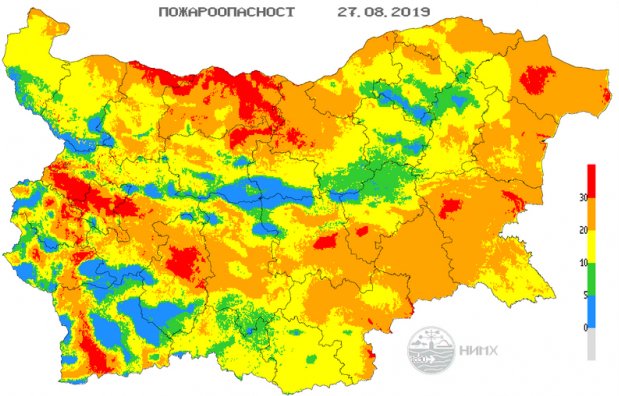 Екстремален индекс за пожароопасност обхваща територии от областите Враца, Плевен, Ловеч, Велико Търново, град София, София, Перник, Кюстендил, Благоевград, Пазарджик, Стара Загора, Сливен, Бургас и Добрич. Този индекс означава, че са възможни бързо разпространяващи се, много силни пожари с въвличане на дървесните корони и трудни за овладяване.