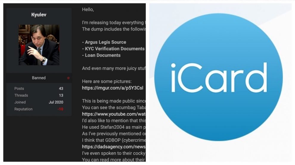 Кредитните досиета на 1800 клиенти на финансовата институция iCard (Айкарт) станаха публично достъпни вчера. Архивът с 21 гигабайта данни беше публикуван от хакер с псевдоним Kyulev в интернет форум. Той твърди, че го е направил като отмъщение, защото не е получил поискан откуп за източените данни. От iCard първоначално отрекоха информацията, но впоследствие признаха за проблема. Стои отворен въпросът дали клиентите и Комисията за защита на личните данни са били информирани в законосъобразния срок, тъй като за пробива се е знаело отдавна.