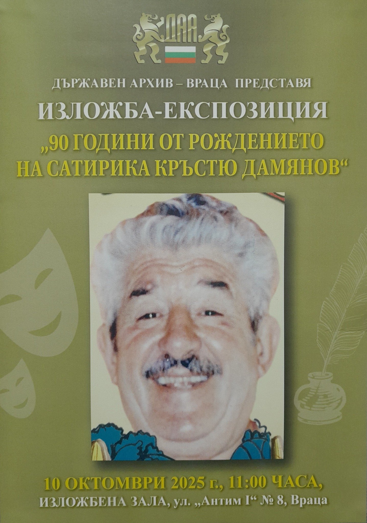 На 10 октомври 2025 г. (петък) от 11:00 часа в Държавен архив – Враца ще бъде открита изложба, посветена на живота и творчеството на врачанския хуморист Кръстю Дамянов, по повод 90 години от неговото рождение.