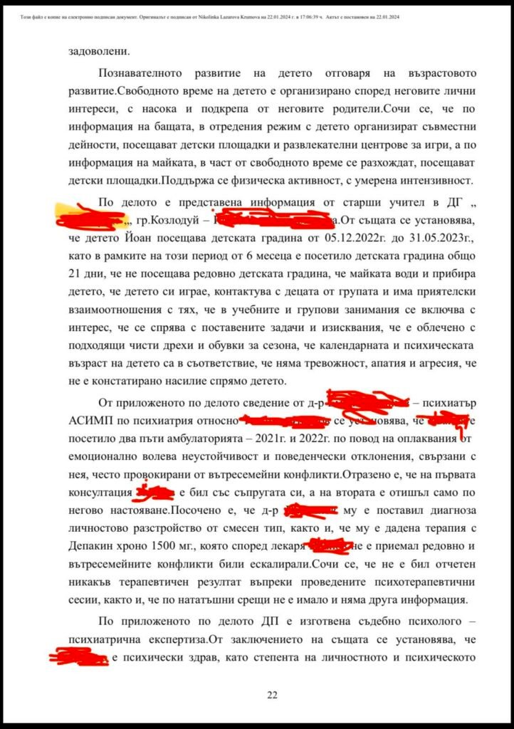По делото са приложени и данни от психиатър, според които бащата е посещавал психиатричен кабинет през 2021 и 2022 г. заради емоционално-волева неустойчивост и поведенчески отклонения, свързвани с вътресемейни конфликти. Посочено е, че му е поставена диагноза личностово разстройство – смесен тип, и е назначена медикаментозна терапия, която по данни на лекаря не е приемана редовно, а конфликтите са ескалирали. Отбелязано е също, че не е отчетен терапевтичен резултат и не е имало последващи срещи.
