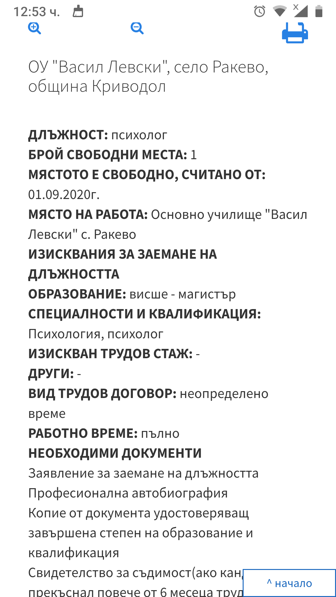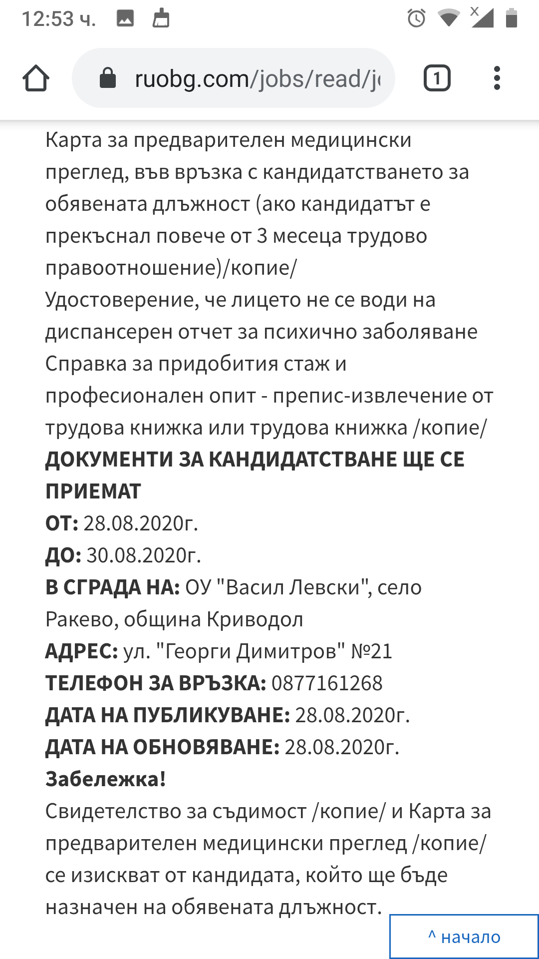 Единственото съобщение за свободно работно място, пуснато от училището в Ракево и то с почти нормален срок, е за начален учител. То е публикувано на 27.08.2020г. до 04.09.2020г.