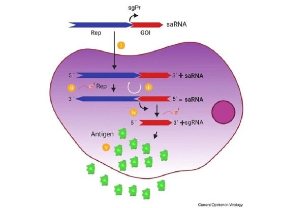 Фиг 2. Самонамножаващи се РНК (saRNA) основана на алфавирус. РНК-векторът е позитивна РНК верига, носеща гена за алфа-вирусна РНК-репликаза (Rep) и гена, представляващ интерес (GOI), пред който има субгеномен промотор (sgPr). След като saRNA влезе в клетката (i), Rep се транслира до белтък – репликаза. Той използва saRNA като матрица върху която синтезира комплементарна негативна saRNA (-saRNA) (ii). Репликазата Rep може да използува тази негативна РНК като матрица за да произведе още saRNA (+saRNA) молекули. Така става самоамфлификацията (самонамножаването) им (iii). В допълнение Rep може да разпознае промотора sgPr в негативната верига и да синтезира позитивна субгеномната мРНК (+sgRNA). Тази sgRNA може да се транслира в белтък и да произведе големи количества от желания антиген, който ще бъде секретиран, ако е снабден с подходящите сигнални пептиди – (v). +saRNA and +sgRNA имат шапки и поли-A опашк. (Вж. и фиг.1).