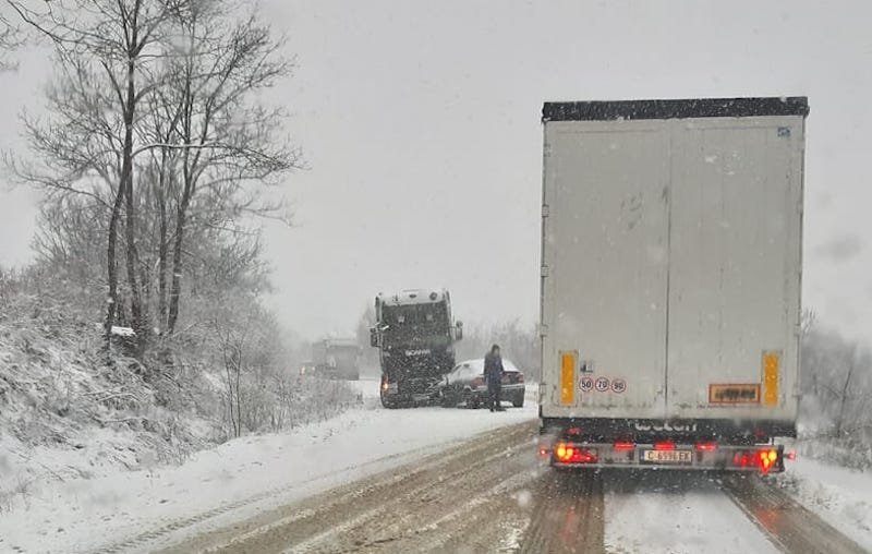 Движението по пътя е затруднено и заради образувала се колона от ТИР-ове и автомобили.
