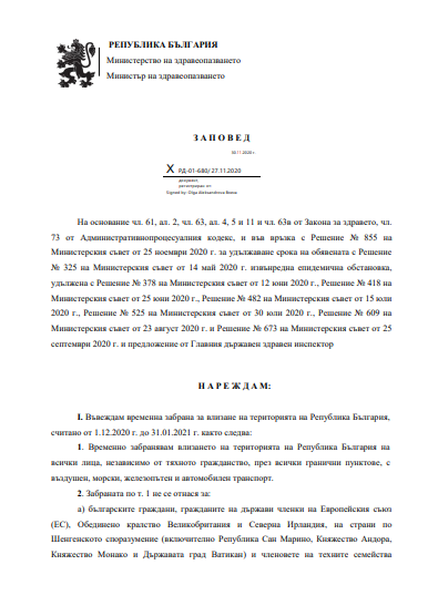 Въвежда се временна забрана за влизане на територията на България от 1 декември до 31 януари.