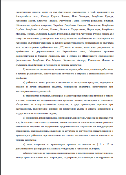 – българските граждани, гражданите на държави членки на Европейския съюз (ЕС), Обединено кралство Великобритания и Северна Ирландия, на страни по Шенгенското споразумение (включително Република Сан Марино, Княжество Андора, Княжество Монако и Държавата град Ватикан) и членовете на техните семейства (включително лицата, които са във фактическо съжителство с тях); гражданите на Австралийски съюз, Канада, Грузия, Япония, Нова Зеландия, Република Руанда, Република Корея, Кралство Тайланд, Република Тунис, Източна република Уругвай, Обединените арабски емирства, Украйна, Република Северна Македония, Република Сърбия, Република Албания, Косово, Босна и Херцеговина, Черна гора, Република Молдова, Израел, Държавата Кувейт, Република Беларус и Република Турция; лицата със статут на постоянно, дългосрочно или продължително пребиваване на територията на Република България и членовете на техните семейства; лицата, притежатели на българска виза за дългосрочно пребиваване вид „D“, както и лицата, които имат разрешение за пребиваване в държава-членка на Европейския съюз, Обединено кралство Великобритания и Северна Ирландия, или в страна по Шенгенското споразумение (включително Република Сан Марино, Княжество Андора, Княжество Монако и Държавата град Ватикан) и членовете на техните семейства;