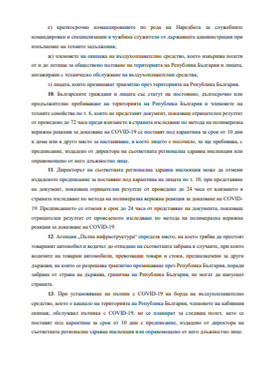 10. Българските граждани и лицата със статут на постоянно, дългосрочно или продължително пребиваване на територията на Република България и членовете на техните семейства по т. 6, които не представят документ, показващ отрицателен резултат от проведен до 72 часа преди влизането в страната PCR тест се поставят под карантина за срок от 10 дни в дома или в друго място за настаняване, в което лицето е посочило, че ще пребивава, с предписание, издадено от директора на съответната регионална здравна инспекция или оправомощено от него длъжностно лице.