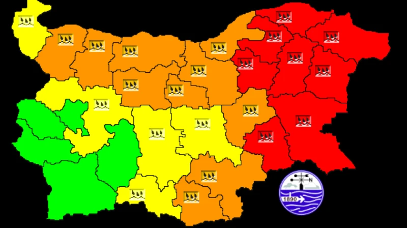Времето днес ще се задържи облачно. Продължителни и значителни валежи от дъжд ще има в Източна и в по-голямата част от Северна България. В източната половина от страната е обявен и червен код за интензивни валежи.В югозападните и централните южни райони от страната валежите ще отслабнат, но с прекъсване все още на места ще превалява дъжд. Ще духа умерен и временно силен вятър от запад-северозапад, а в североизточните райони – от север-североизток. Максималните температури ще бъдат между 10° и 15°, за София – около 10°. В планините ще бъде облачно. В масивите на Югозападна България с прекъсване ще вали дъжд, в местата над 1800 метра надморска височина – сняг. По-значителни и продължителни ще бъдат валежите по Стара планина и Странджа. Ще духа силен вятър от север-северозапад, а по най-високите части – от север-североизток. Максималната температура на височина 1200 метра ще бъде около 8°, на 2000 метра – около 0°. По Черноморието ще бъде облачно с продължителни и значителни по количество валежи. Ще духа умерен и силен северозападен вятър, а по Северното Черноморие – от север-североизток. Максималните температури ще бъдат между 14° и 19°. Температурата на морската вода е от 18°-19° по Северното Черноморие до 20°-21° по Южното. Вълнението на морето ще бъде около 3 бала.