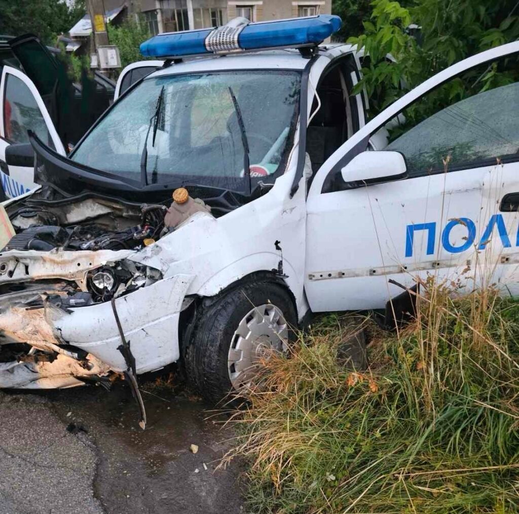 Инцидентът е станал при преследване на моторист, който успял да се измъкне, но патрулната кола и преминаващ автомобил са се сблъскали. При удара полицейската кола е с размазана предница.