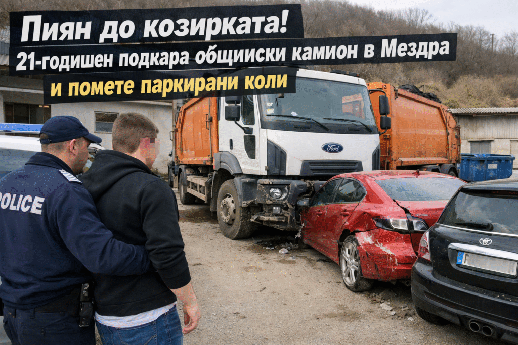 Истински екшън се разиграл навръх 14 февруари в Мездра, след като 21-годишен младеж с над 3 промила алкохол в кръвта се качил зад волана на общински сметоизвозващ камион и се врязал в паркирани автомобили.