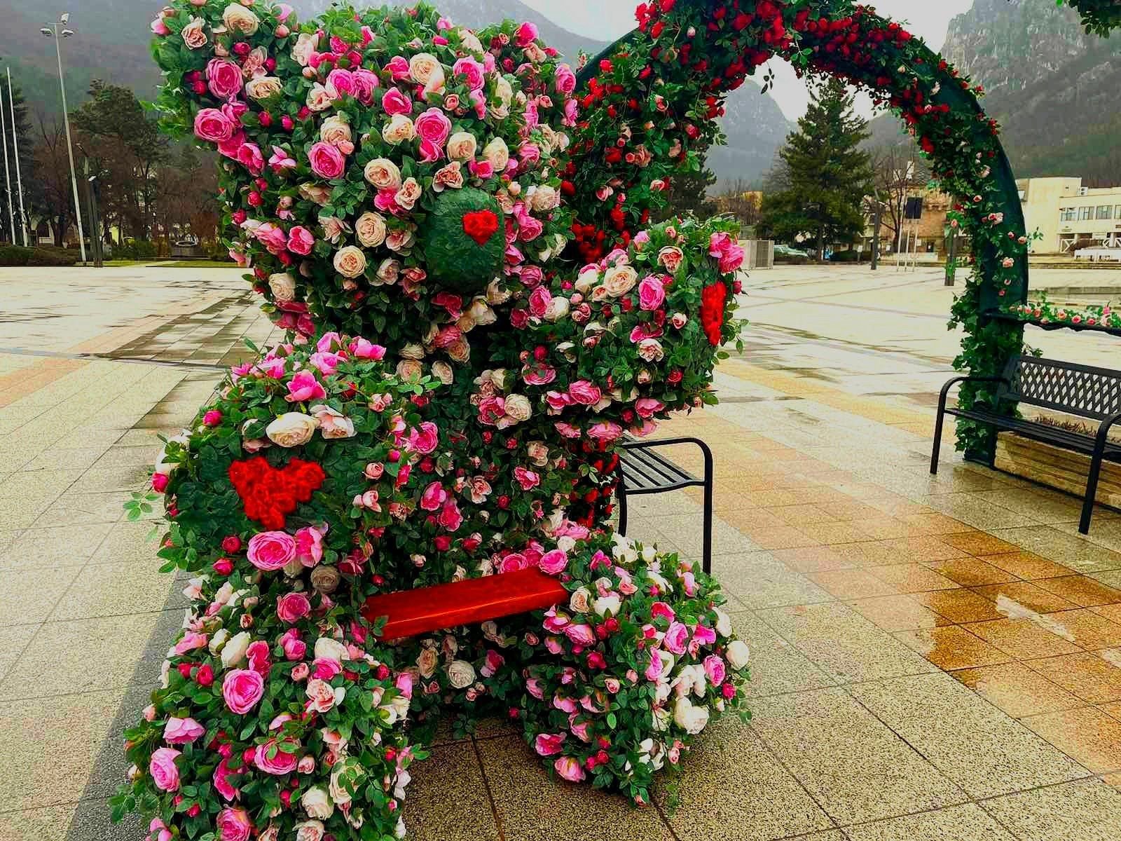 На площад „Христо Ботев“ в града засия красива арка, украсена в празнични цветя, а до нея голямо цветно мече, на което влюбените двойки, а и не само, могат да си направят красиви снимки.