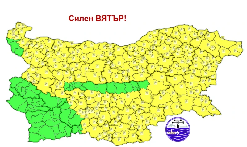 За по-голямата част от България в сила е жълт код за силен вятър. Очаква се поривите да достигнат до 20 m/s.