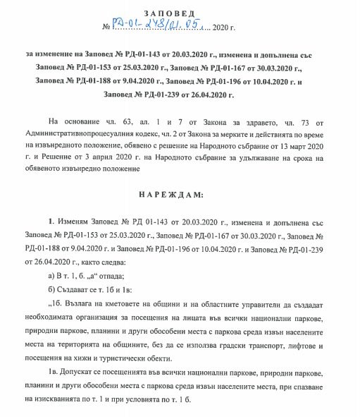 Със своя заповед, издадена днес, 1 май, министърът на здравеопазването Кирил Ананиев възлага на кметовете на общини и на областните управители да създадат необходимата организация за посещения на гражданите във всички национални паркове, природни паркове, планини и други обособени места с паркова среда извън населените места на територията на общините, без да се използва градски транспорт, лифтове и посещения на хижи и туристически обекти.