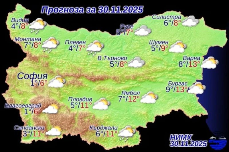 В планините ще е облачно с леки валежи, а по Черноморието – променлива облачност, температури до 12°–13° и вълнение 2–3 бала.