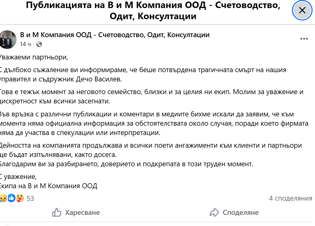 Полицията установи самоличността на една от жертвите на тройното убийство в хижа в района на прохода Петрохан. Загиналият е Дечо Василев, който е бил един от управителите на счетоводната фирма „В и М Компания“ ООД.
