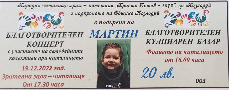НЧХП “Христо Ботев – 1879”, гр. Козлодуй, кани всички граждани и гости на гр. Козлодуй на благотворителен коледен концерт в подкрепа на Марти!