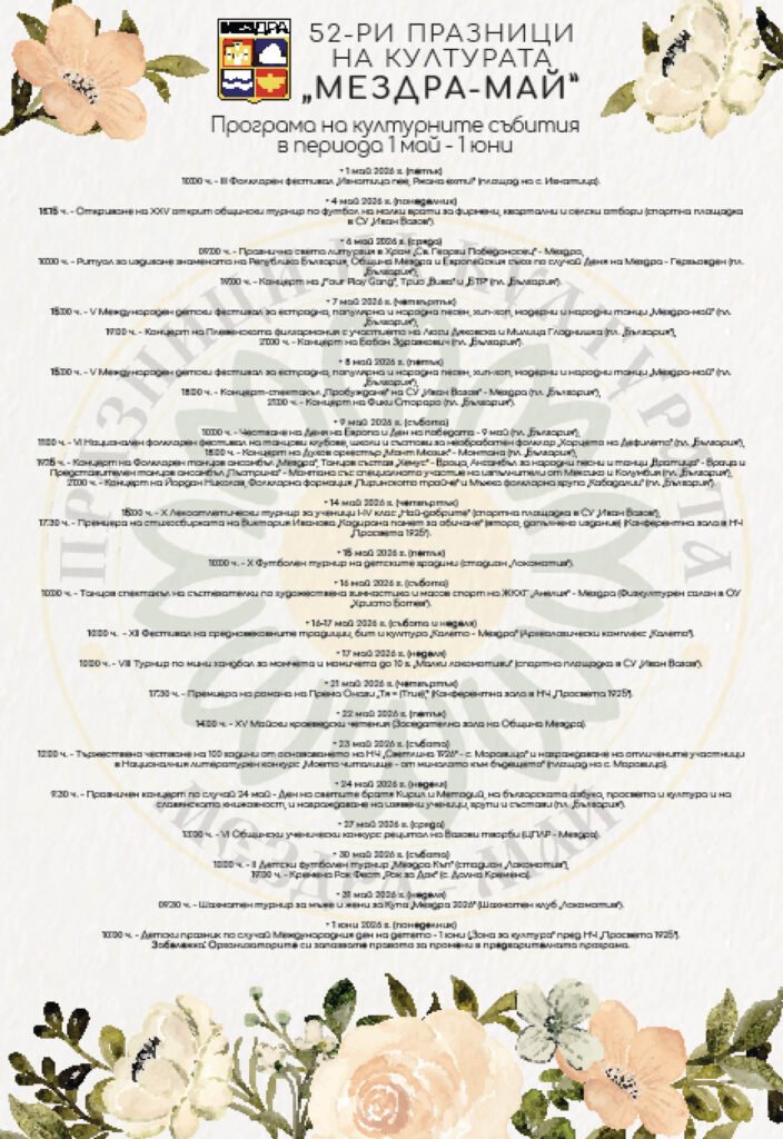 Мездра представи официалната програма за 52-рите Празници на културата „Мездра-май“, които ще се проведат в периода 1 май – 1 юни 2026 г.