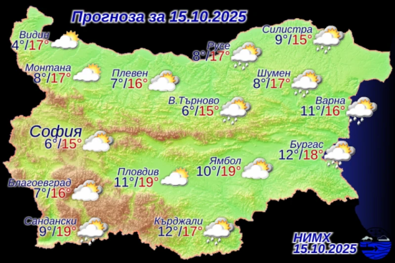 По-съществени разкъсвания и намаления на облачността ще има преди обяд главно над северозападната част от страната. Ще духа слаб северозападен, в Източна България североизточен вятър. Максималните температурите ще бъдат между 14° и 19°, в София – около 15°.