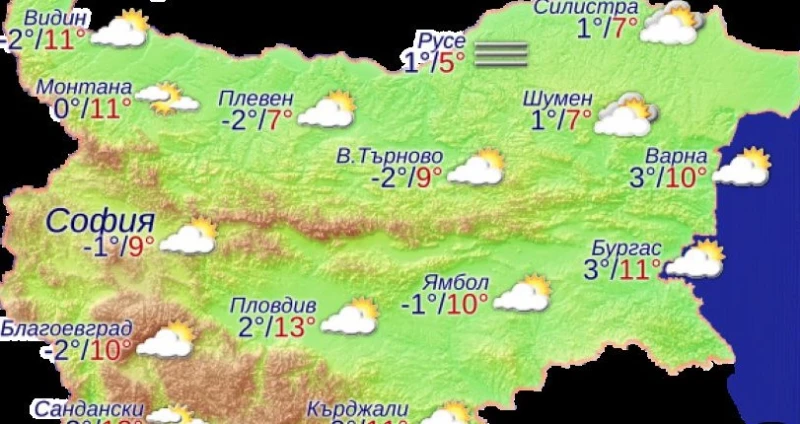 В по-голямата част от страната денят ще премине с преобладаващо слънчево време. Максималните температури ще бъдат между 7 и 12 градуса, като в районите с по-трайна мъгла ще останат по-ниски. В София се очакват около 9 градуса.