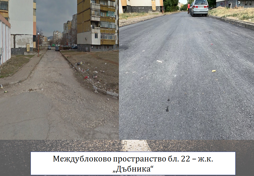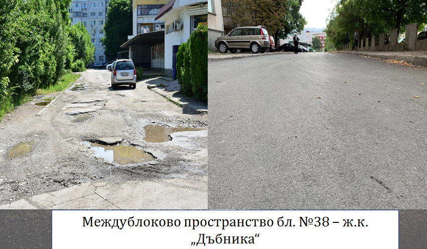 От началото на месец август се асфалтираха участъци и в ж.к. „Дъбника“ – междублоковите пространства при блоковете №6, 7, 8, 13, 22 и 38, като дейностите ще продължат“ – коментира кметът Каменов и допълни, че е започнала и цялостната рехабилитация на улица „Складова“, която е в изключително тежко състояние.