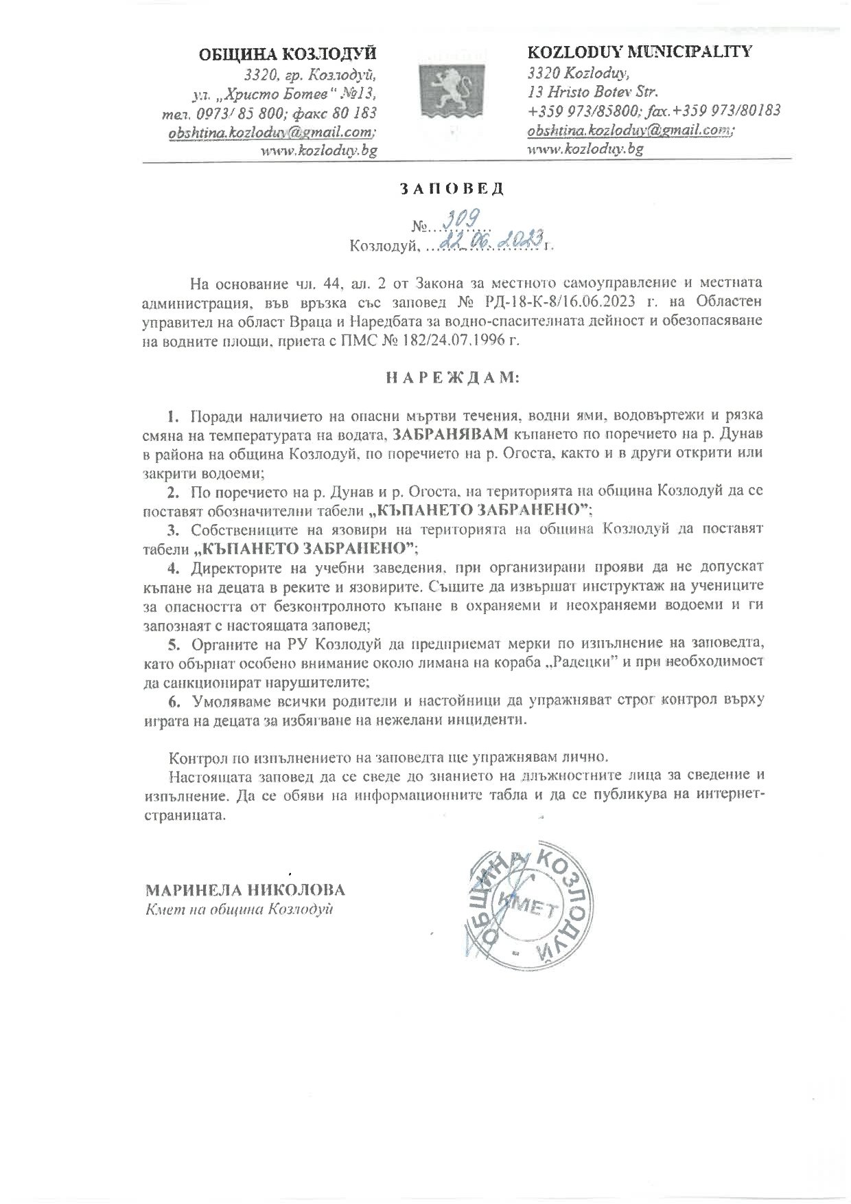 Това стана със заповед № 309/22.06.2023 г. на кмета на община Козлодуй Маринела Николова.