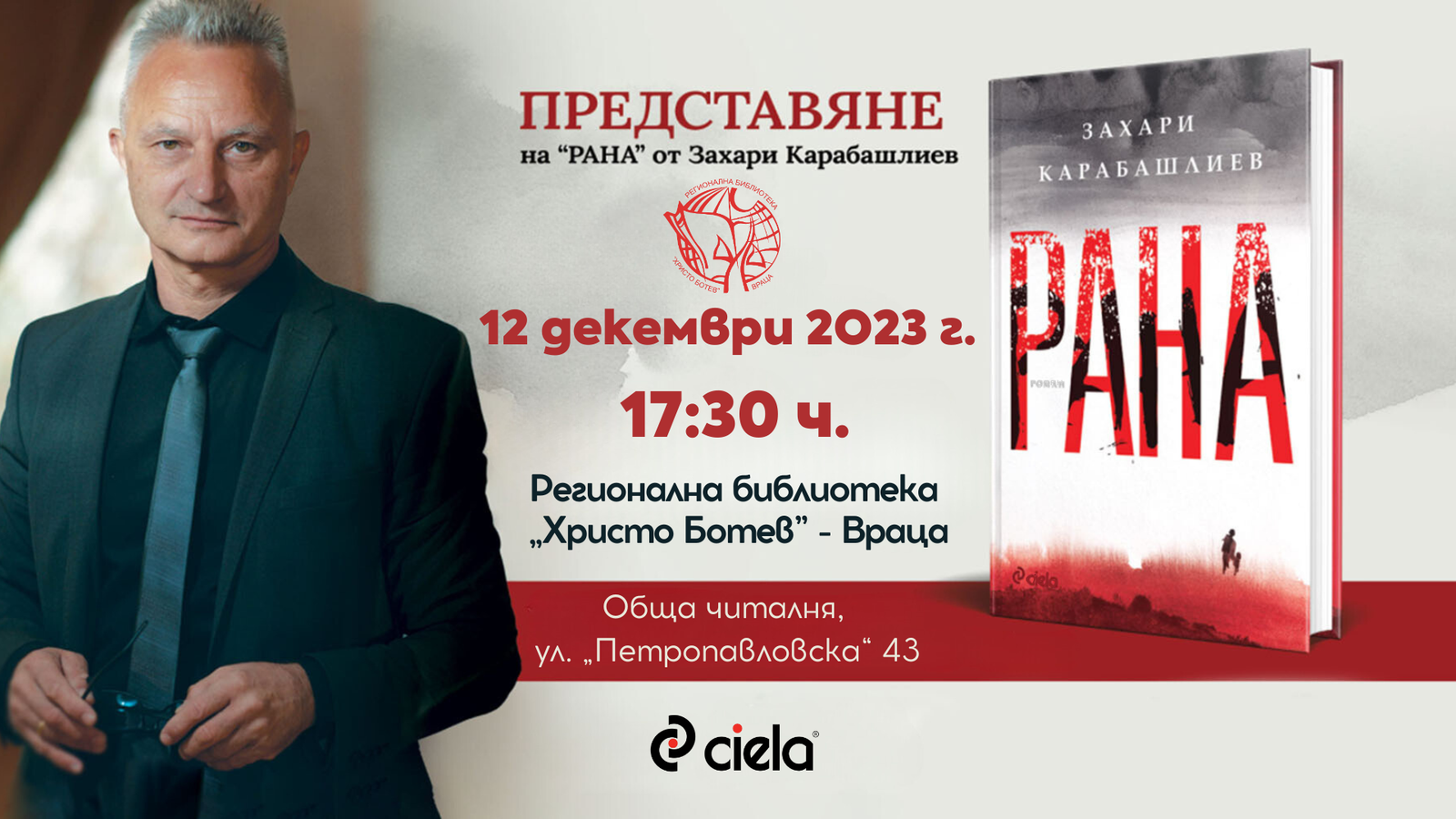 Регионална библиотека „Христо Ботев“ ви кани на представянето на романа „Рана“ от Захари Карабашлиев на 12 декември от 17:30 часа в „Обща читалня“ (ул. „Петропавловска“ 43).