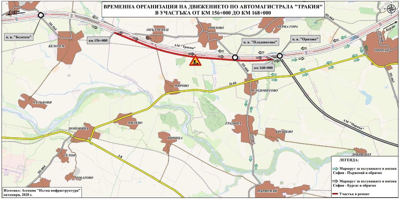От 5 октомври започва ремонтът на първите 12 км от автомагистрала „Тракия“ в платното за Бургас от общо 52 км, които ще бъдат обновени поетапно. Участъкът, който ще се ремонтира, е от 156-ти км, след пътен възел „Белозем“, до 168-ми км преди пътен възел „Оризово“. По време на строителните дейности трафикът ще се осъществява двупосочно в платното за София, като скоростта на движение ще е до 70 км/ч. Необходимо е шофьорите да карат с повишено внимание и да спазват стриктно поставената пътна сигнализация.