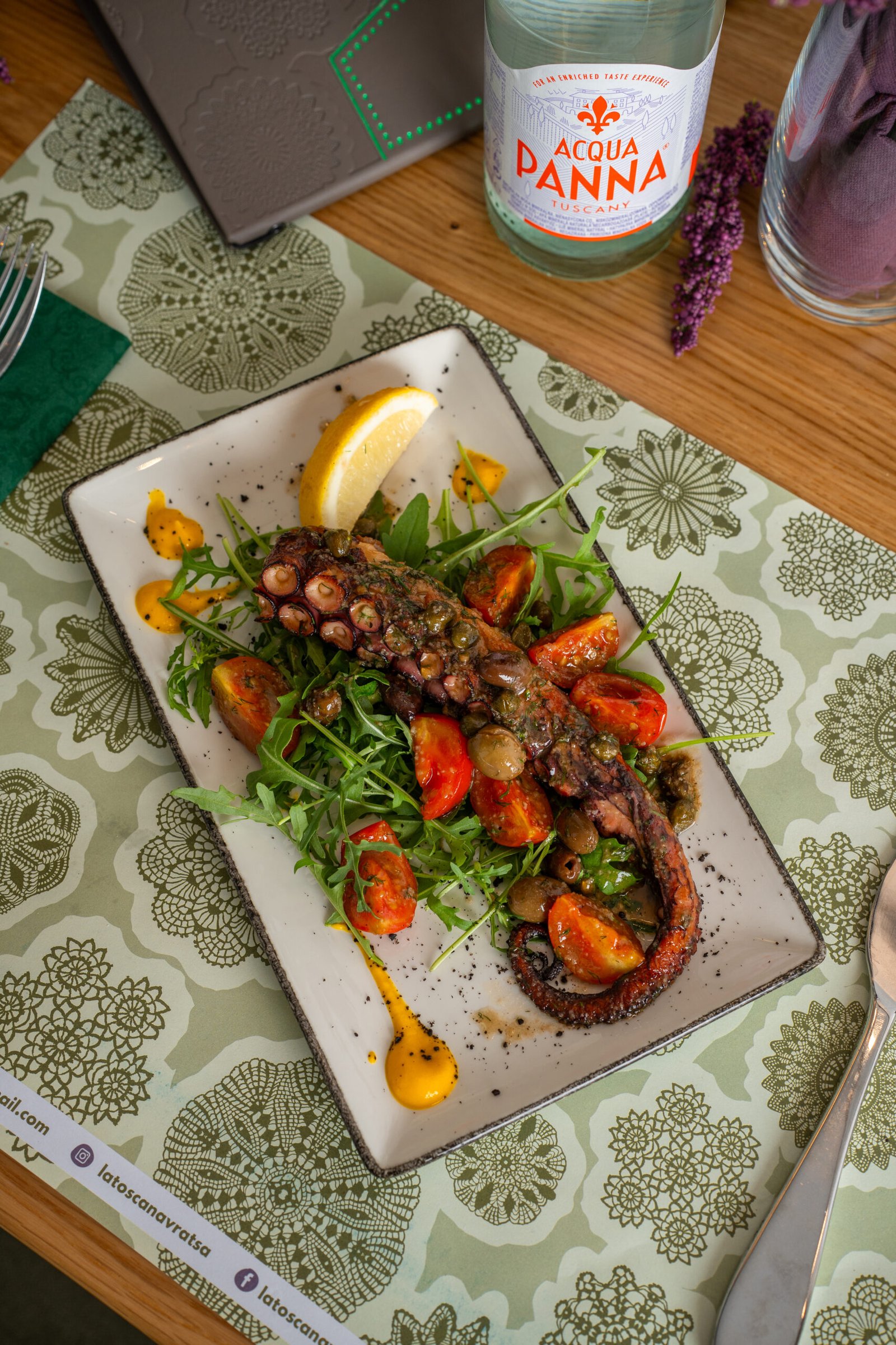 Сред стартерите, които впечатляват с лекота и здравословен профил, е сотираният октопод в тоскански стил – приготвен с чери домати, чесън, каперси, билково масло, маслини Таджаска и свежа рукола.
