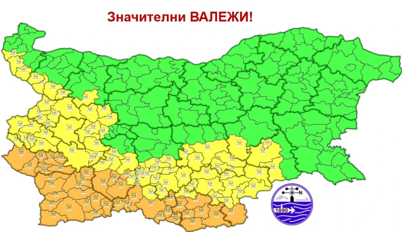 Жълт код за значителни валежи е обявен за София, София-област, Перник, Видин, Монтана, Враца, Пловдив, Стара Загора, Сливен и Ямбол. В тези райони се очакват количества дъжд между 20 и 30 литра на квадратен метър.