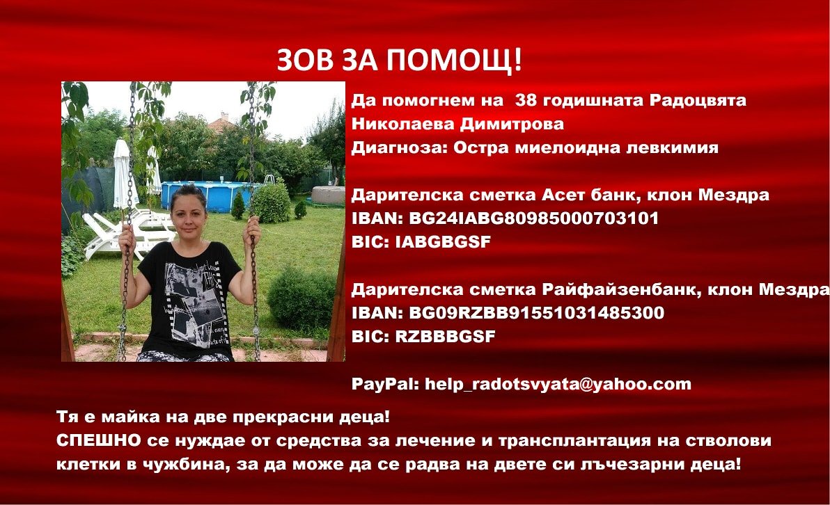 Радоцвята е 38-годишна и е майка на две деца. За да оздравее и да остане до тях се налага да й бъде направена трансплантация на стволови клетки в чужбина.